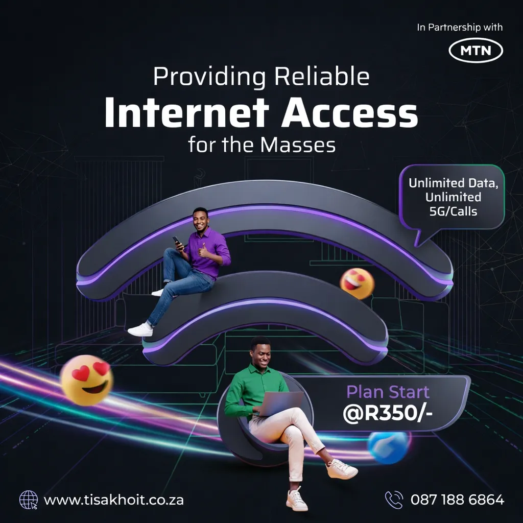 Tisakho IT, your trusted technology partner headquartered in Nelspruit, Mpumalanga, proudly distributes and supports reliable connectivity solutions powered by the MTN Network across South Africa, including strong coverage in areas like Pretoria and Gauteng. With MTN's award-winning mobile network – recognized as one of the best for speed and reliability in 2025 – customers enjoy seamless unlimited SIM card data options and high-performance 4G/5G connections for home, business, or on-the-go use. Whether you're in bustling Pretoria or the growing hub of Nelspruit, Tisakho IT helps you access MTN's robust coverage for uncapped mobile data, fast LTE/5G home internet, and dependable service without the hassle of contracts or surprises. Contact Tisakho IT today to check your MTN network availability and upgrade to lightning-fast, unlimited connectivity tailored to your needs!